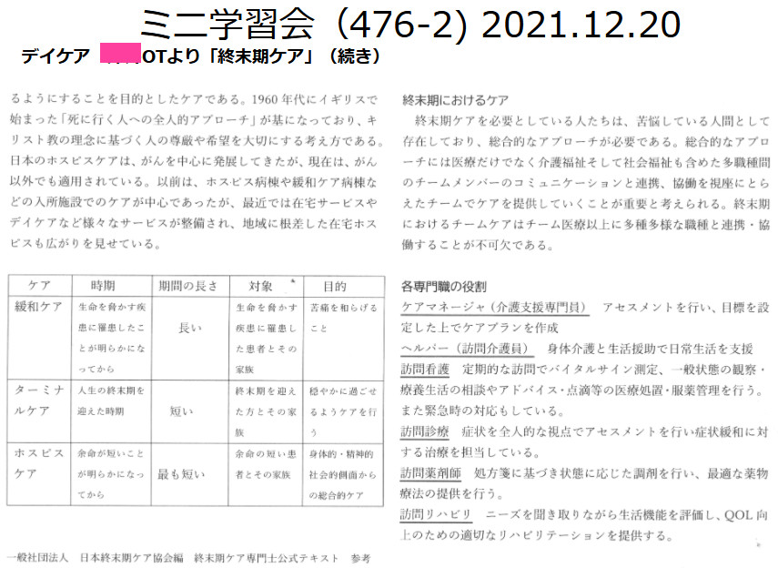 デイケア 〇〇OTより「終末期ケア」